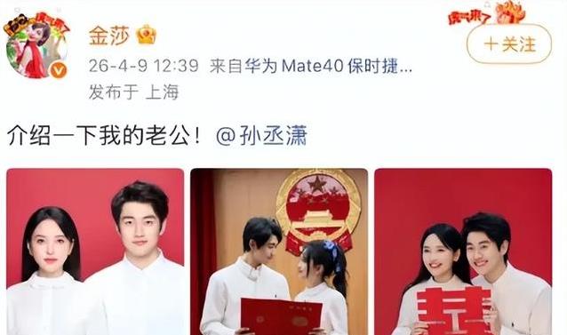 金莎和孙丞潇在社交平台上发布了消息,互相介绍对方。金莎写道介绍一下我的老公,并提到孙丞潇的名字。孙丞潇也回应,介绍一下我的老婆。两人同时晒出领取结婚证当天的照片,画面中他们身穿白色衬衫,背景以红色为主,看起来庄重而正式。